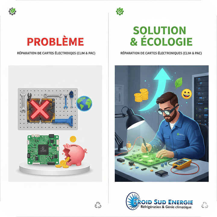 La réparation électronique est l'un des piliers de l'économie circulaire. Dans un secteur comme celui du CVC (Chauffage, Ventilation, Climatisation), où les équipements sont volumineux et riches en métaux rares, réparer une carte plutôt que de remplacer l'unité complète a un impact écologique massif.